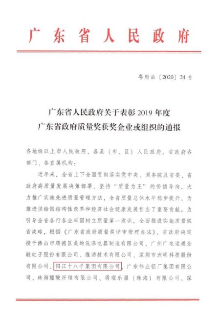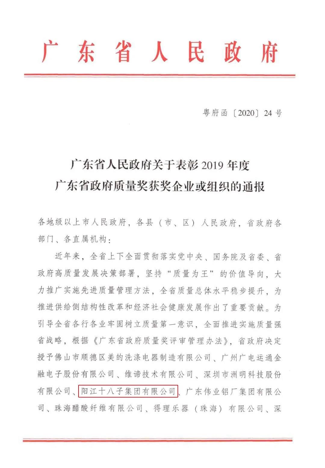 近日,廣東省人民政府發(fā)布了《關(guān)于表彰2019年度廣東省政府質(zhì)量獎(jiǎng)獲獎(jiǎng)企業(yè)或組織的通報(bào)》,10家企業(yè)榮獲2019年度廣東省政府質(zhì)量獎(jiǎng),其中,陽江十八子集團(tuán)有限公司榮膺上榜,成為廣東粵西地區(qū)首家獲此殊榮的企業(yè)。